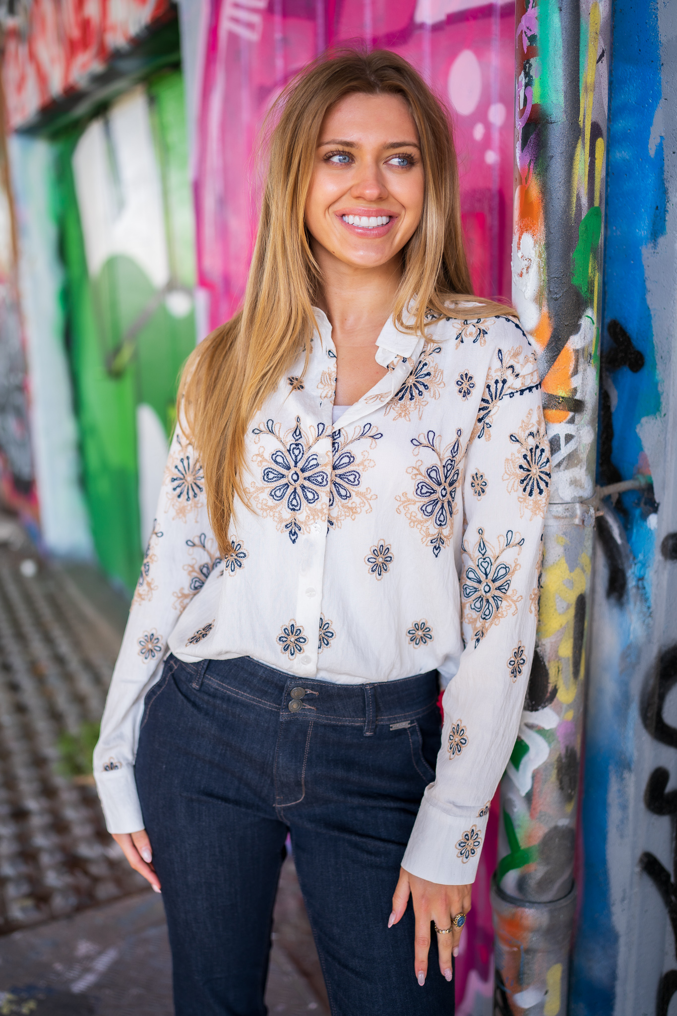 65% katoen 35%. viscose, leuke lange mouw blouse, doorknoop, kraagje, blouse valt lang en ruim, heerlijk materiaal, prachtige bloem borduursels.