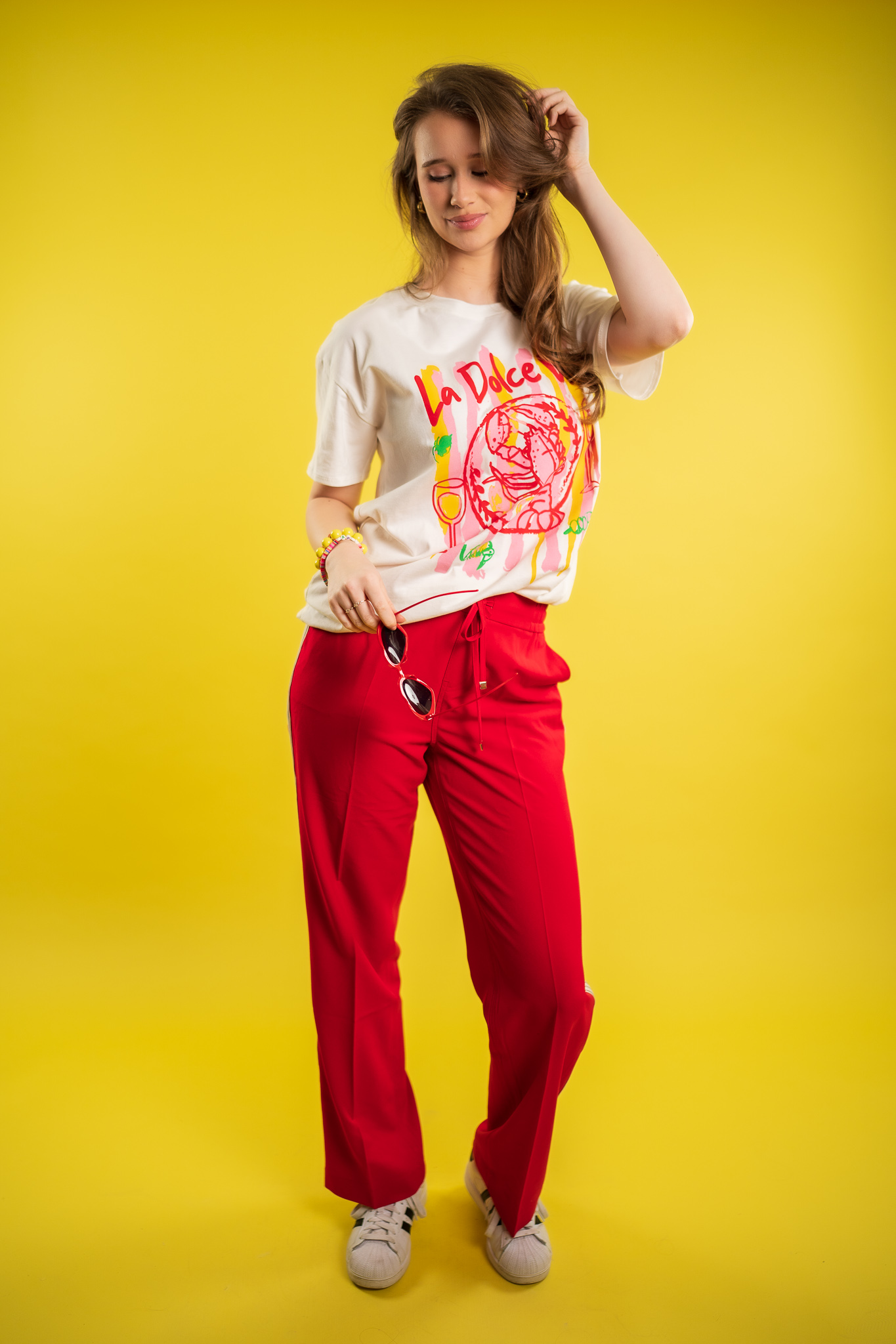 95% katoen 5% elasthan, wijd shirt, one size past t/m maat 40, frisse print voor met ‘la dolce vita’ en kreeft.