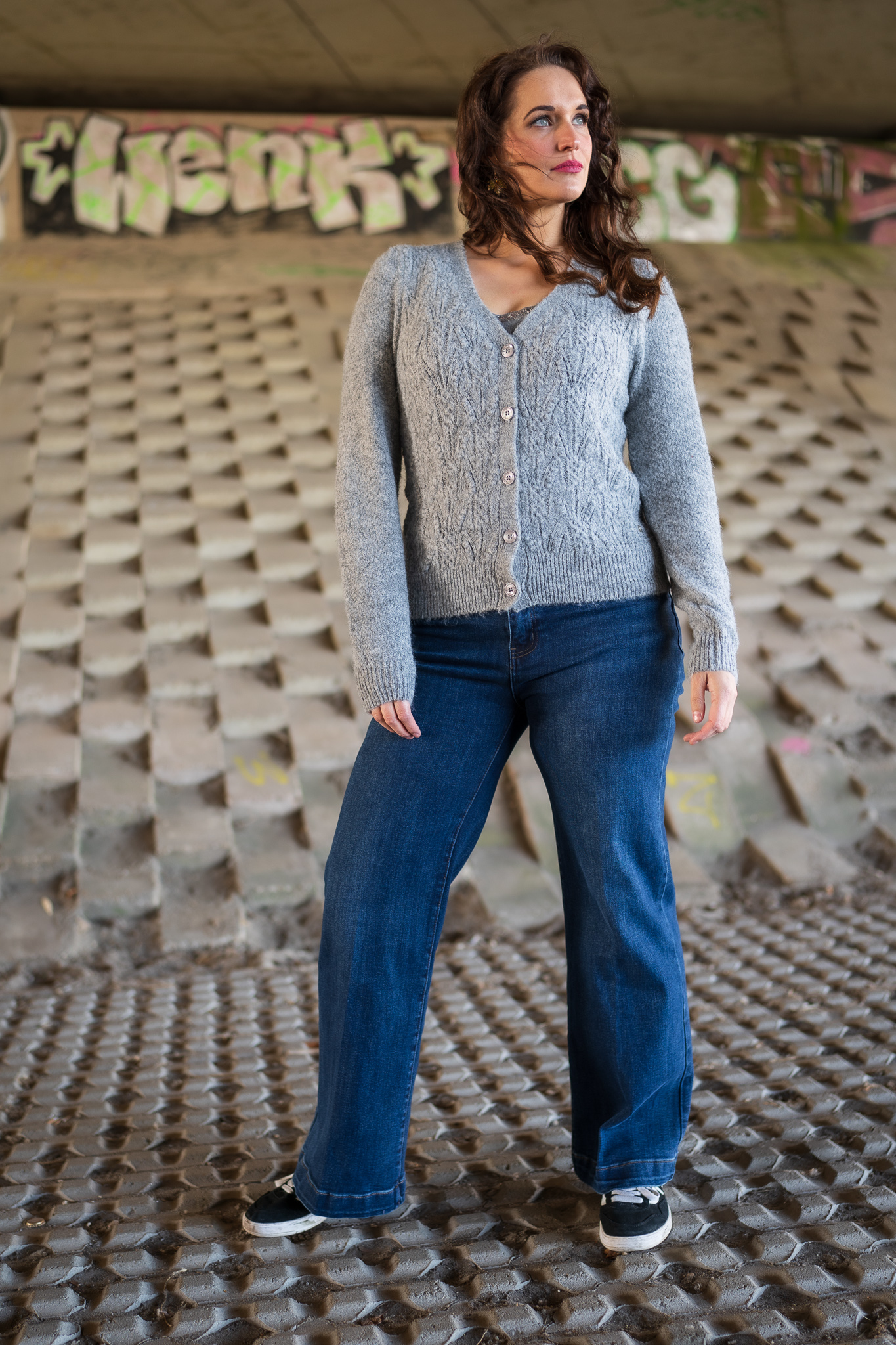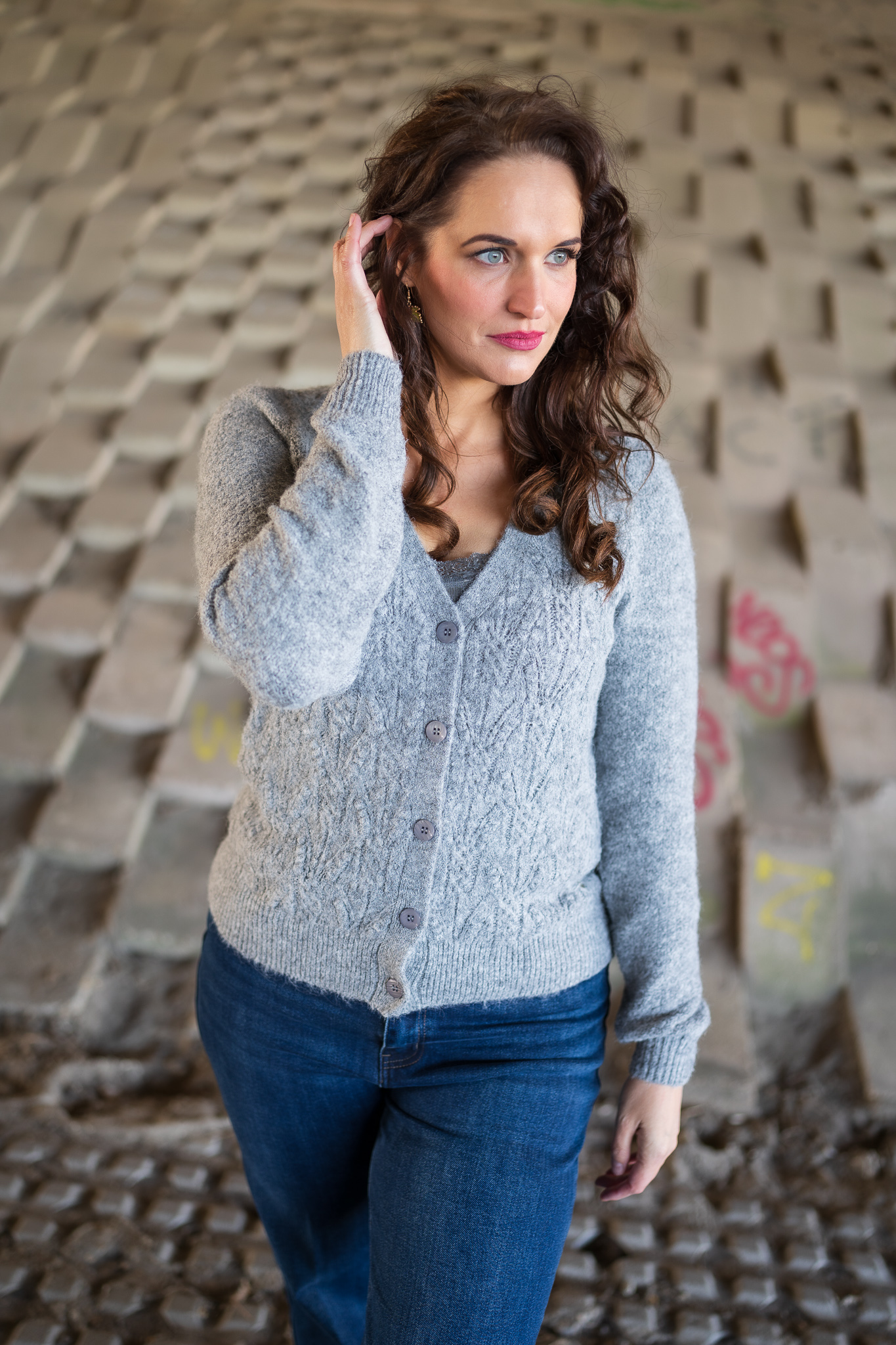 75% polyester 18% nylon 6% wol 1% elasthan, leuk ajour gebreid vest, v-hals, knoopsluiting, melee grijs, heerlijk zacht vest!
