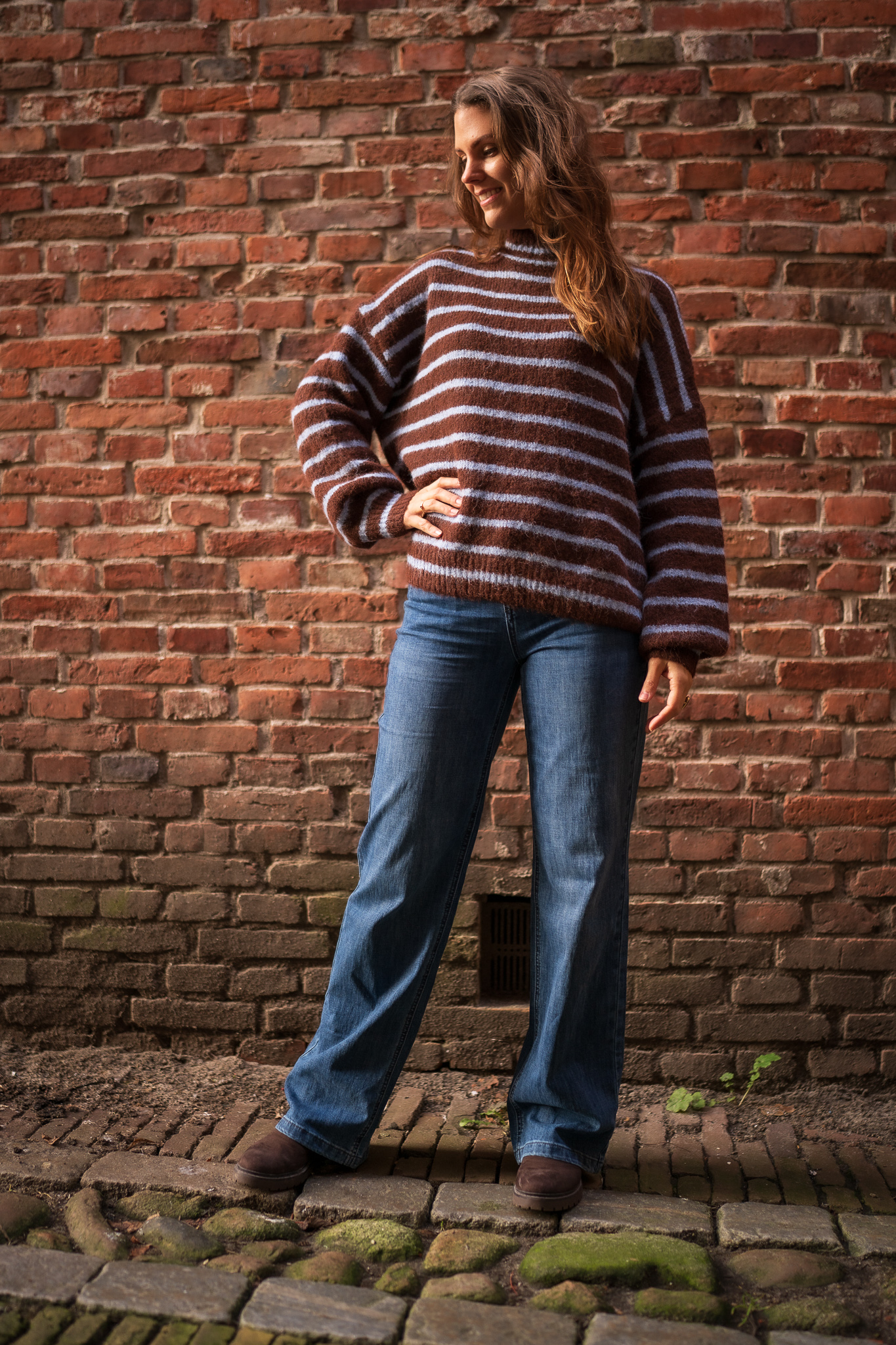 20% polyamide 2% elasthan 68% recycled polyester 10% wol, streepjes trui, turtle kraag, wijd maar vrij kort, one size past t/m ca maat 40.